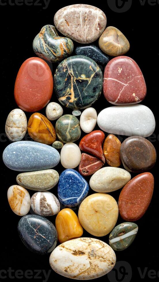 A collection of polished stones, various colors and patterns, arranged in an oval shape against a black background Pro Photo