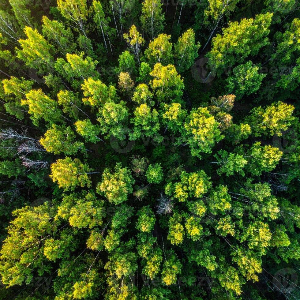 High-angle view of a dense forest. Green trees in a symmetrical pattern Pro Photo