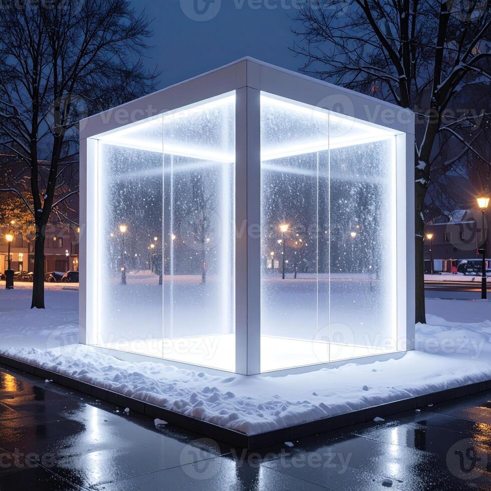 A white cube structure, bathed in soft white light, sits in a snowy urban park at night. The cube's glass panels are clear, reflecting the surrounding scene. Snow blankets the ground, and the reflections of light and snow are visible on the pavement Pro Photo