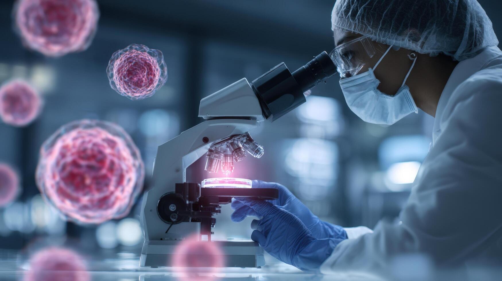 A scientist in lab coat examining cells under microscope with floating cell structures around her photo