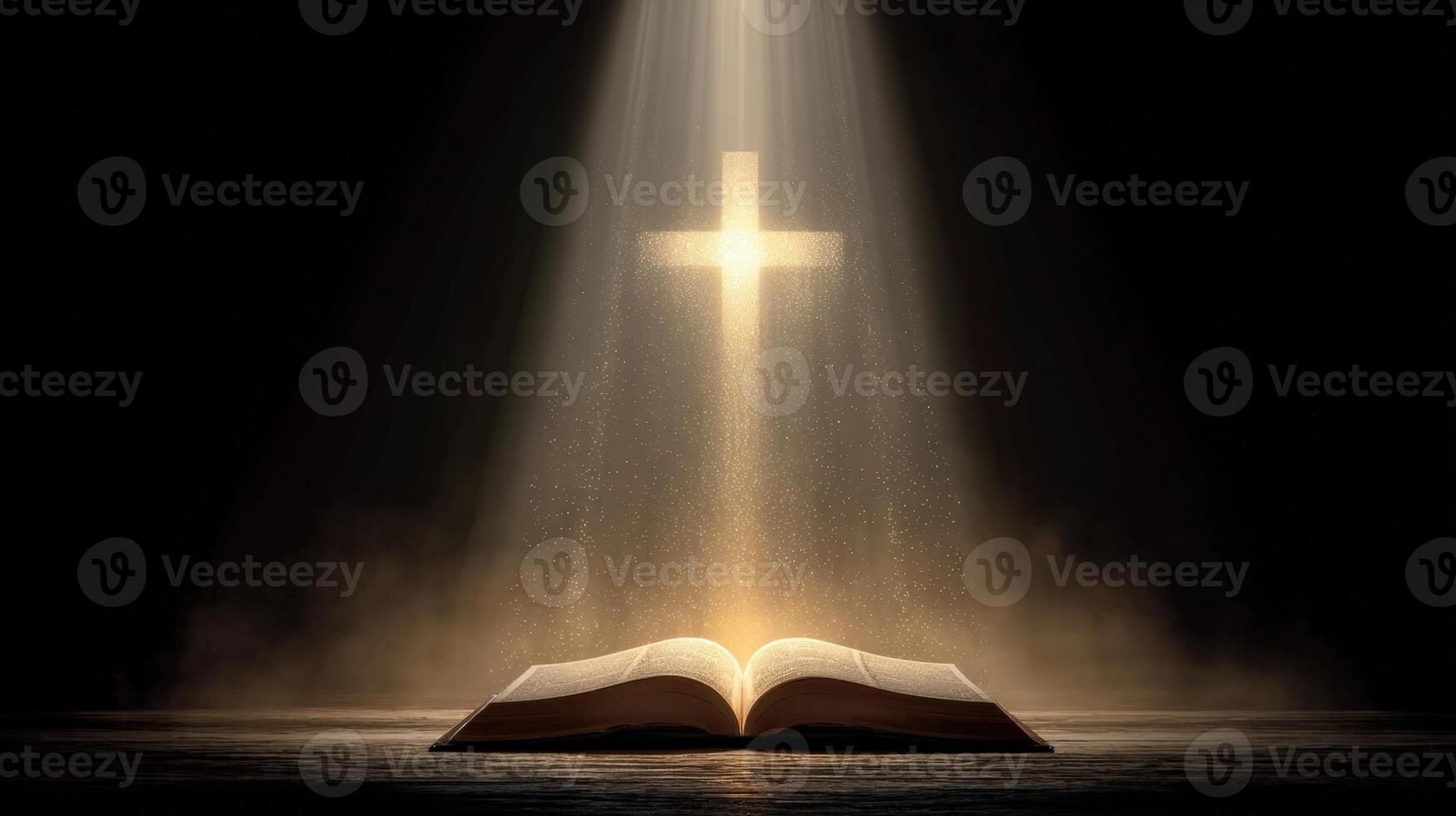 Open book with light shining on it and a cross in the background in a dark and mysterious setting Pro Photo