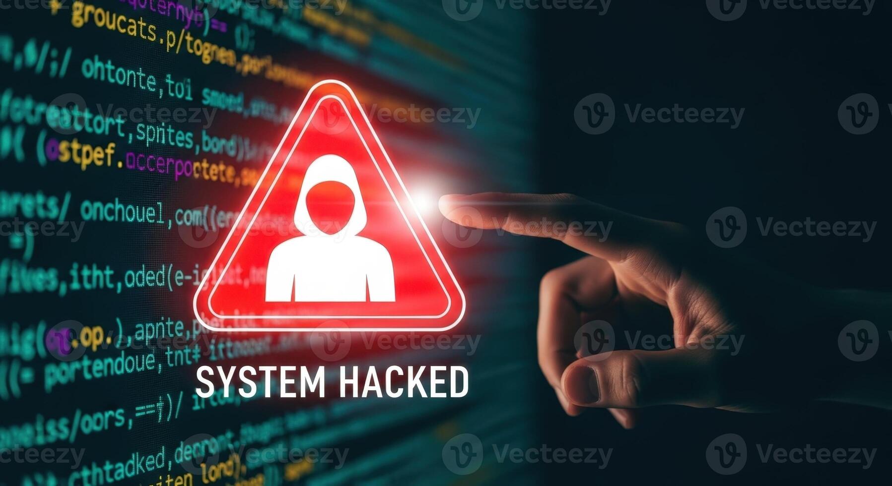 System hacked alert with hooded figure and hand over code background indicating cyber security threat Pro Photo