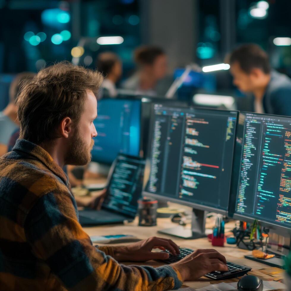 Focused developer codes on multiple monitors in a busy office environment late at night. photo