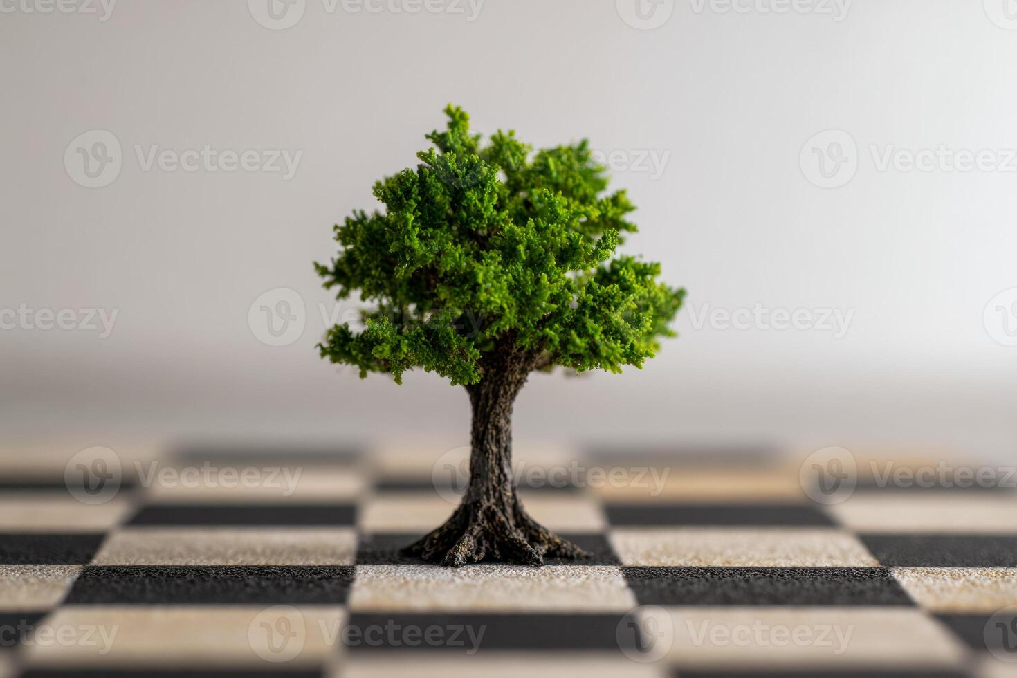 Miniature tree standing alone on a black and white chessboard symbolizing growth and strategy in a conceptual environment with soft focus background Pro Photo
