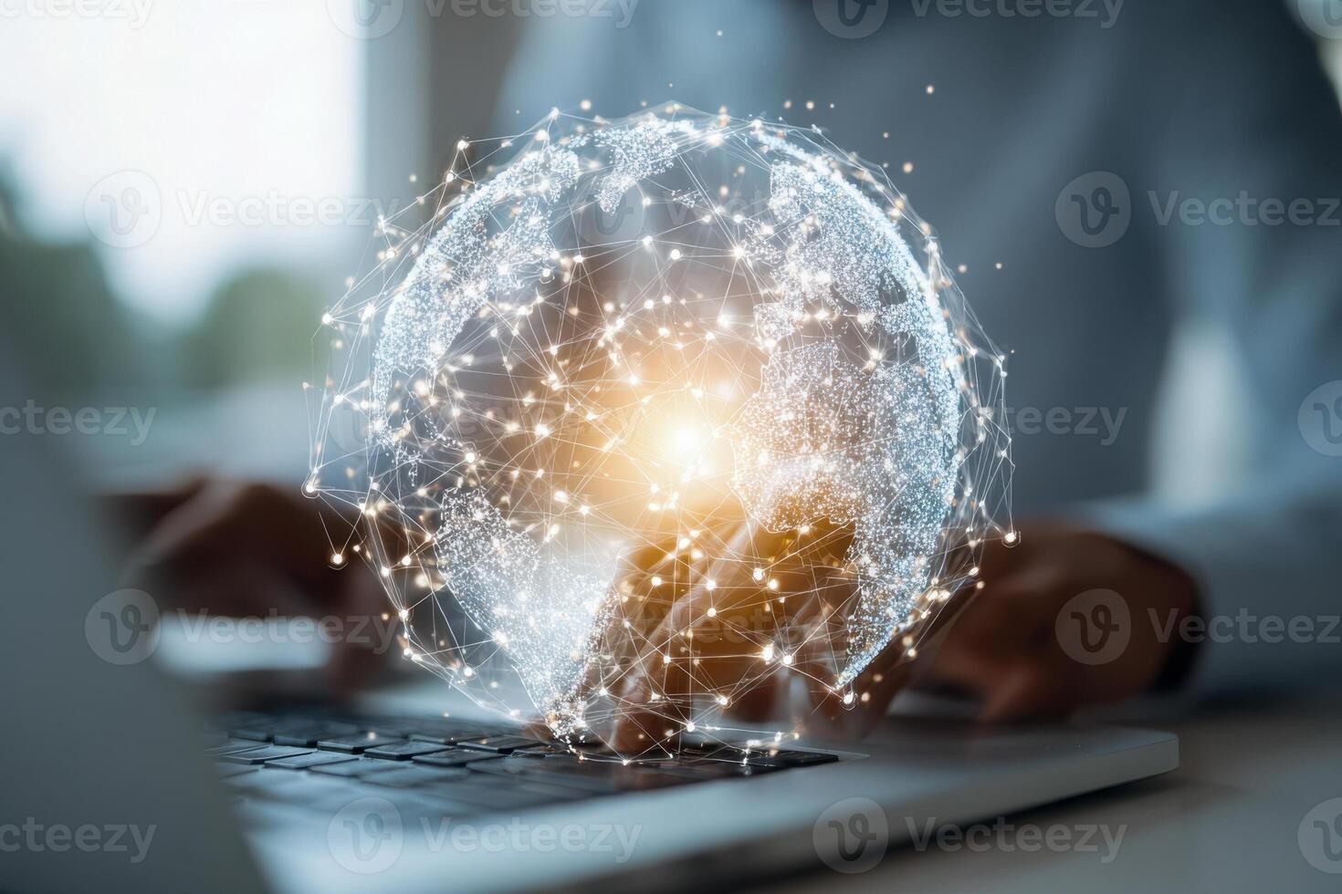 Innovative digital globe with interconnected data points glowing above a laptop keyboard symbolizing global technology and network connectivity in modern business Pro Photo