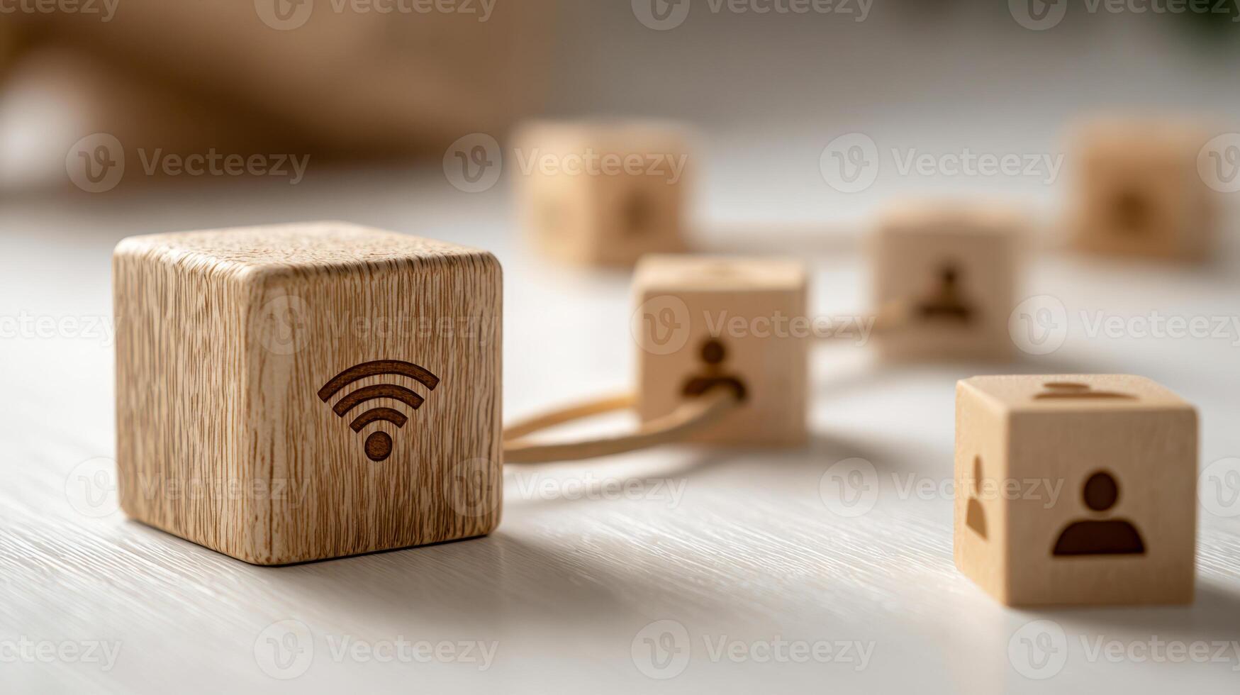 Wooden cubes connected by cords with wireless network and user icons representing digital communication and social networking concepts on light surface Pro Photo