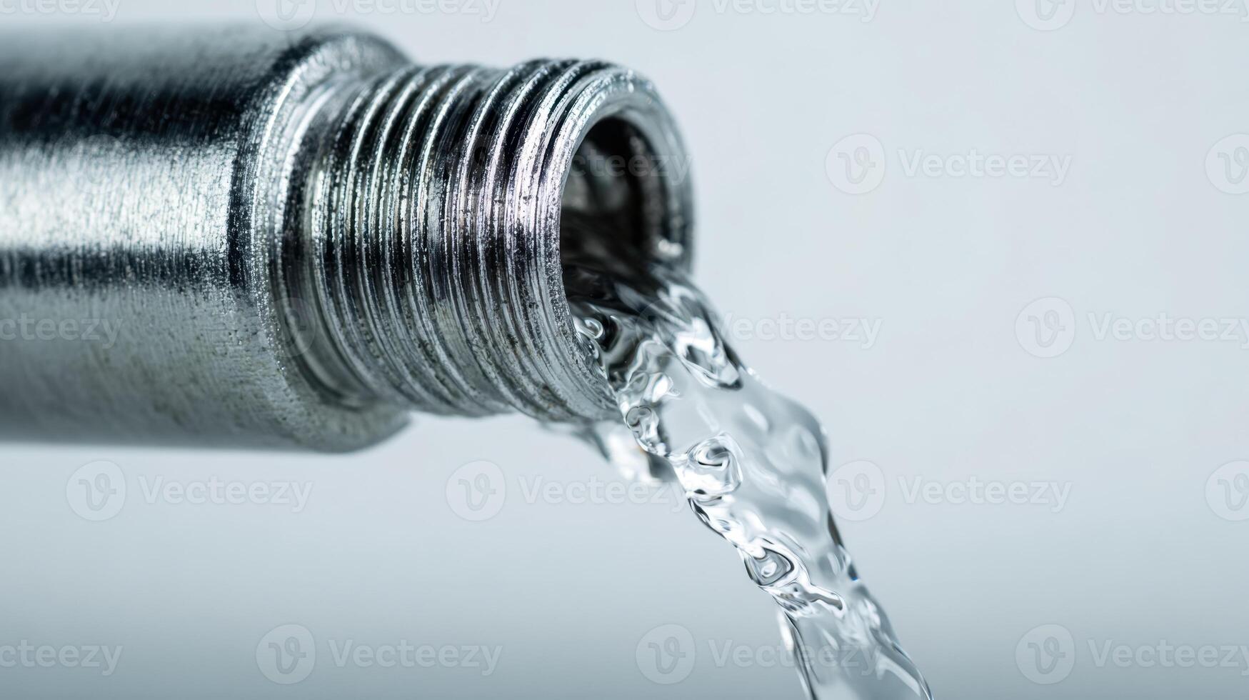 Flowing clear water pouring out from a shiny metallic pipe with spiral threading against a soft light background for plumbing and fluid dynamics concepts Pro Photo