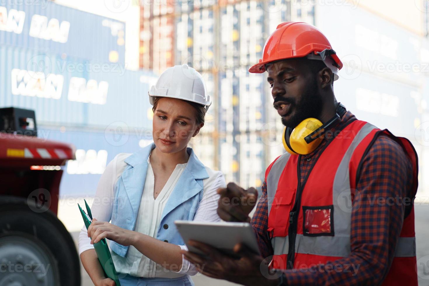 Foreman checking containers in the terminal, at import and export business logistic company. Pro Photo