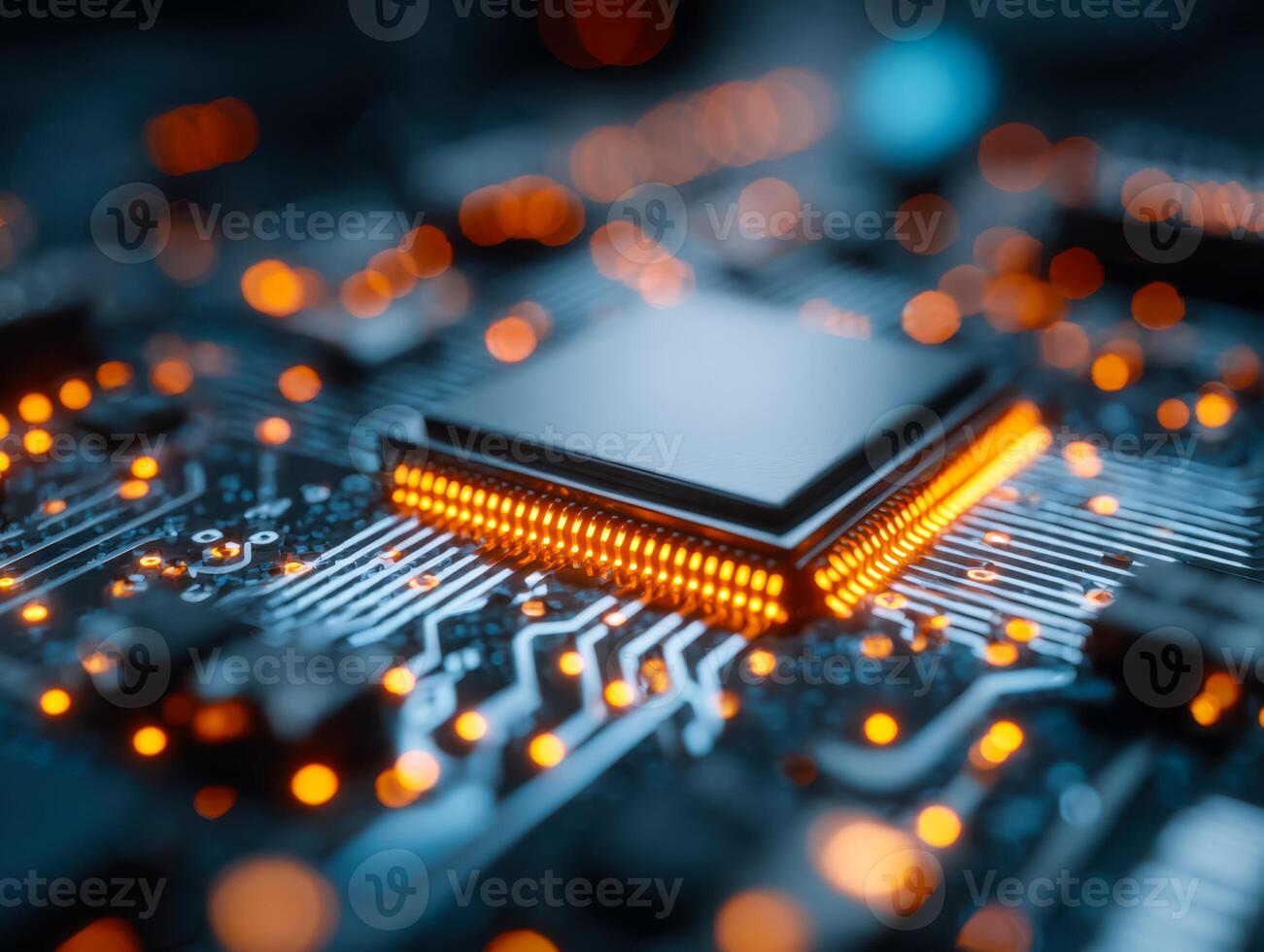 High-tech microchip with glowing orange circuits on a futuristic motherboard symbolizing advanced computing and electronic innovation in technology systems Pro Photo