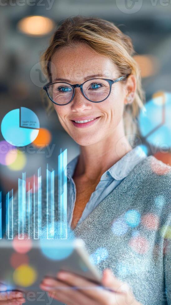 Financial analyst using digital tools to analyze earnings data while smiling at the camera Pro Photo