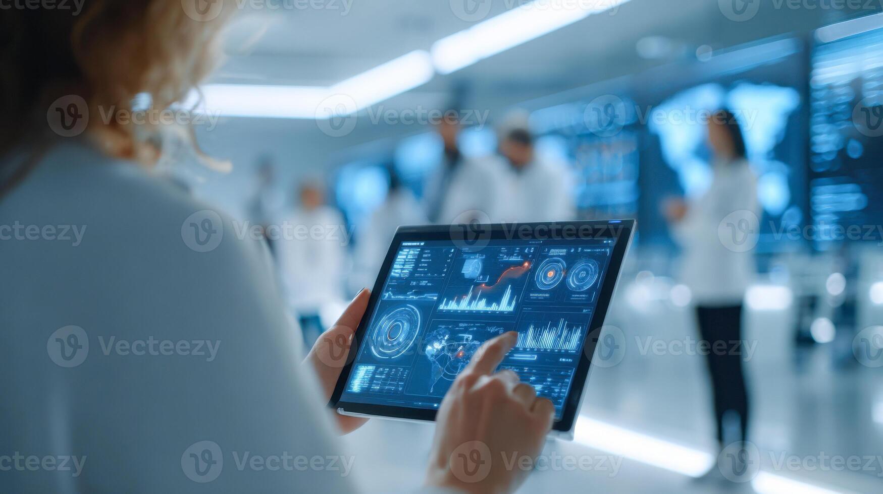 Business analyst uses tablet for data visualization and analysis in modern workspace setting Pro Photo