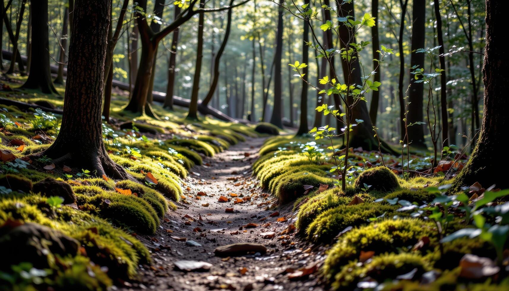 ancient moss covered trail winds gently through quiet woodland, soft sunlight creating delicate dappled patterns on path. photo