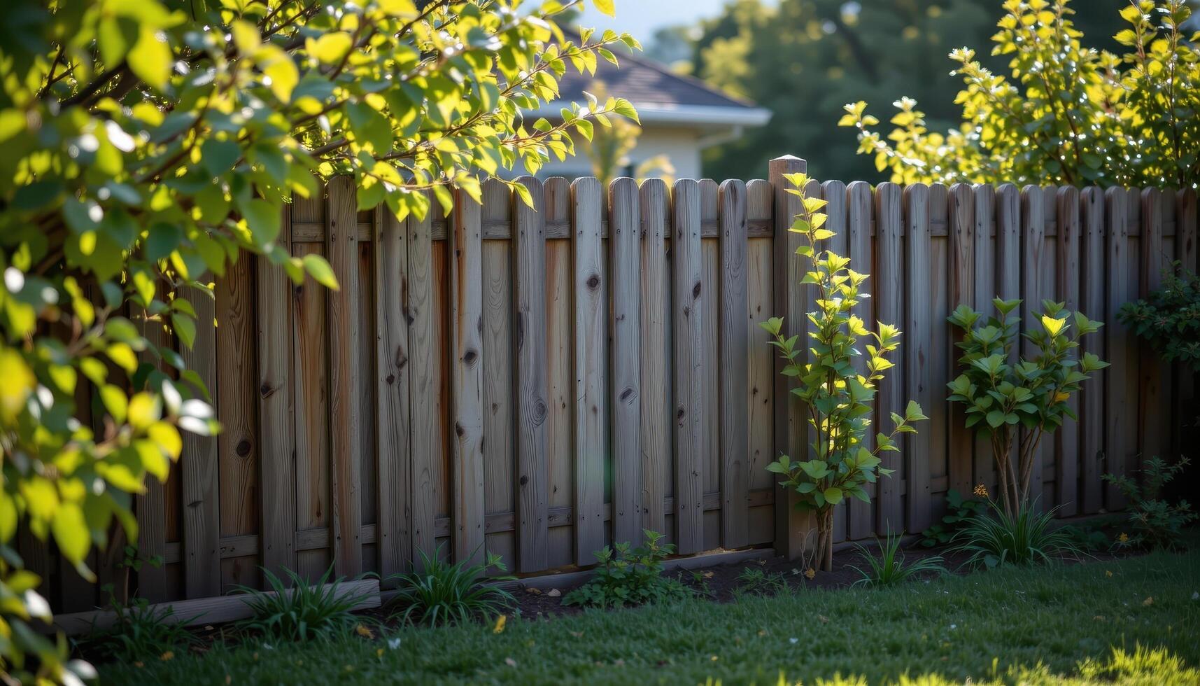 rustic fence in garden with small trees, sunlight illuminating leaves, shadows creating calm tranquil backyard scene fully captured. photo