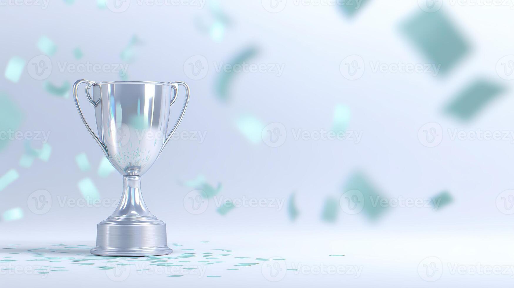 Silver trophy placed on a smooth surface, surrounded by colorful confetti, symbolizing achievement and celebration in a festive atmosphere with a soft gradient background Pro Photo