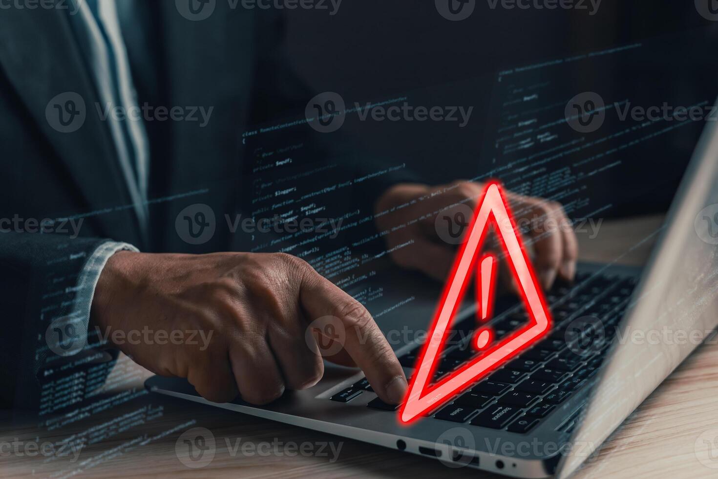 A professional uses a laptop displaying a glowing red warning triangle with an exclamation mark, symbolizing caution and cybersecurity threats in a digital environment filled with code. Pro Photo