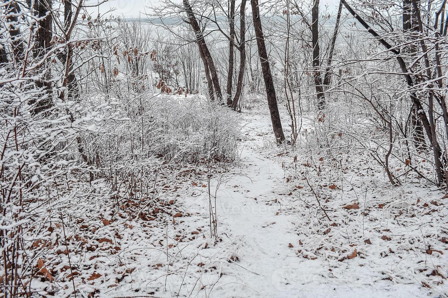 The park is covered with a thin layer of snow in winter.. ..The park with tall trees and paths is covered with snow. Pro Photo