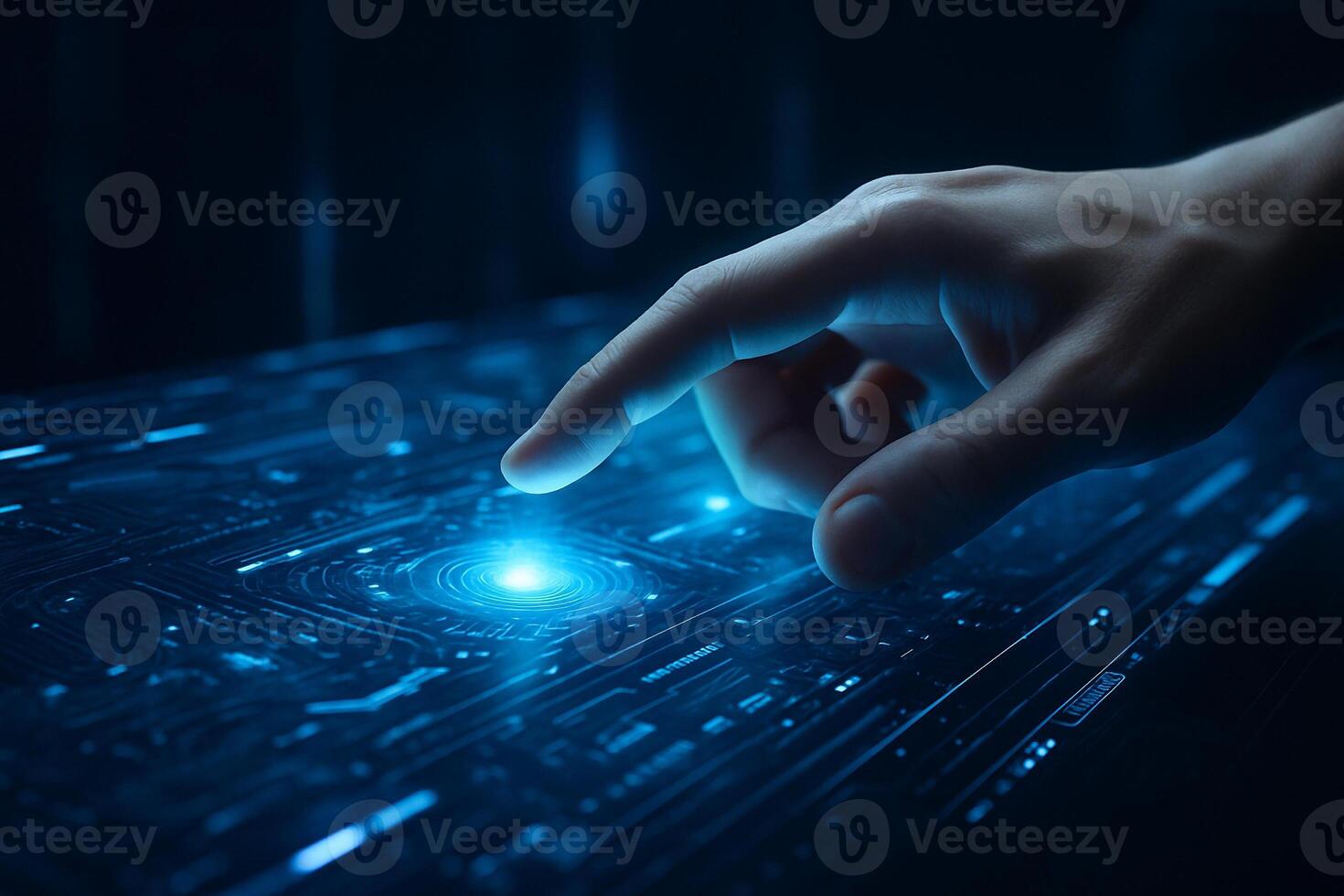 futuristic digital art of human hand interacting with glowing cyber interface symbolizing human computer interaction data connectivity and advanced technology Pro Photo