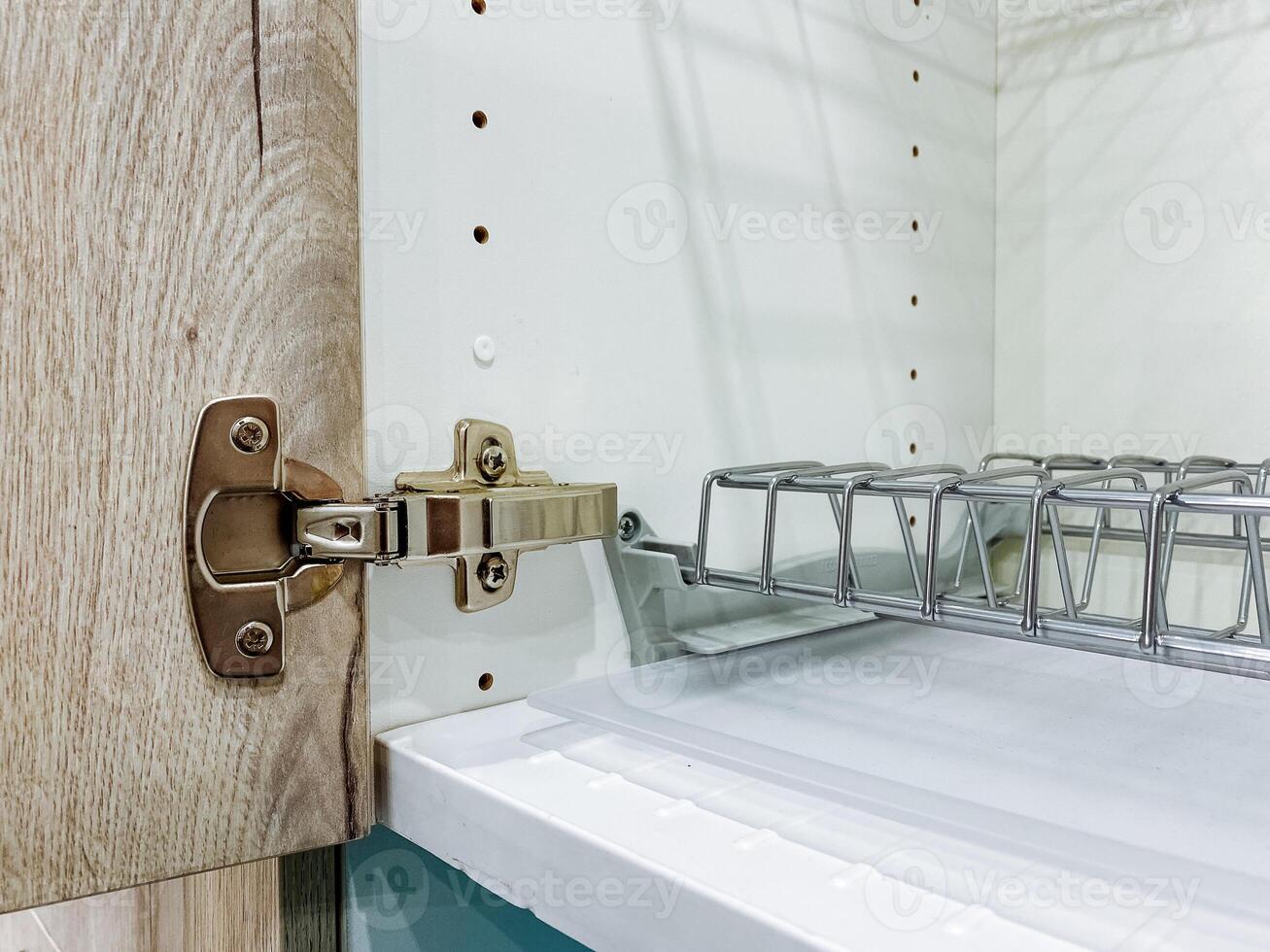 This is a detailed closeup image of a cabinet door hinge, showcasing the intricate design and functionality of the hinge on a wellcrafted cabinet used for storage or display purposes Pro Photo