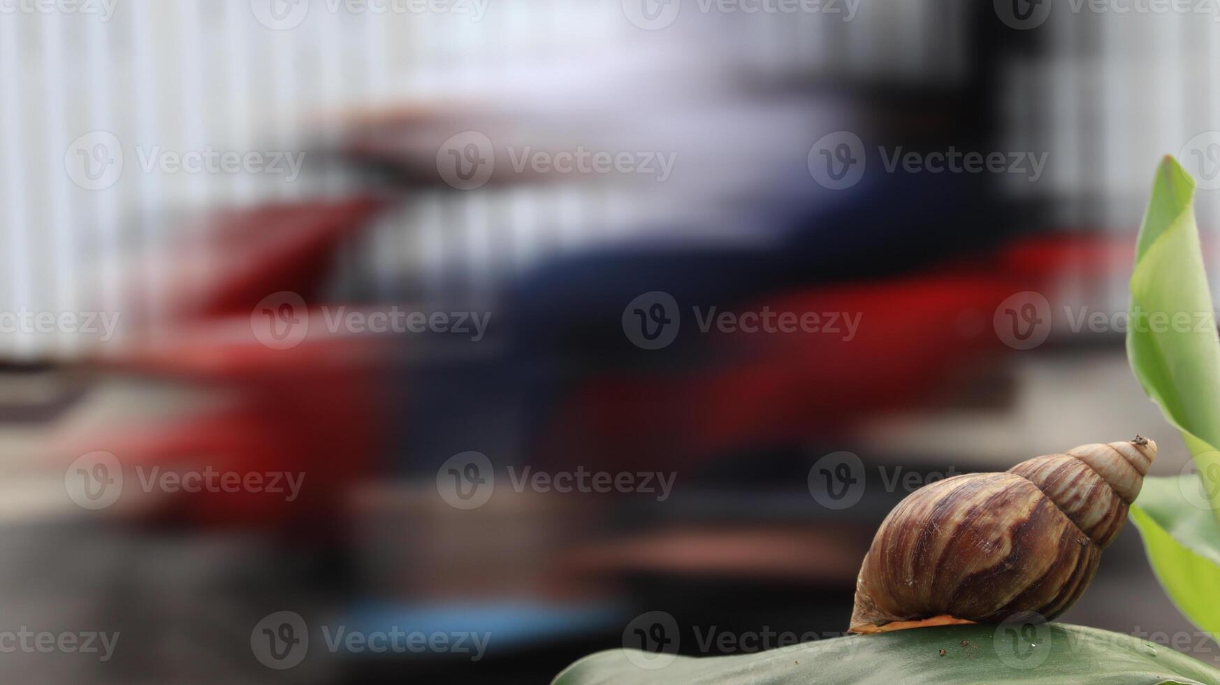Snail rests on a green leaf while a blurred motorcycle speeds by in the background, creating a humorous contrast of slow and fast pace. Pro Photo