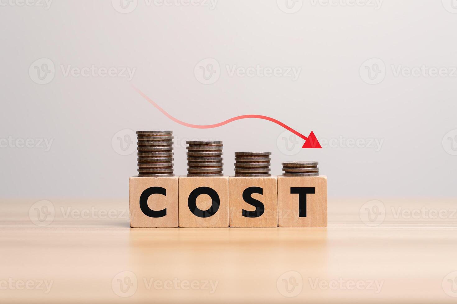 Concept of cost reduction in business finance with wooden blocks spelling COST placed on descending stacks of coins, red downward arrow, symbolizing decreasing expenses, saving strategy, efficien Pro Photo