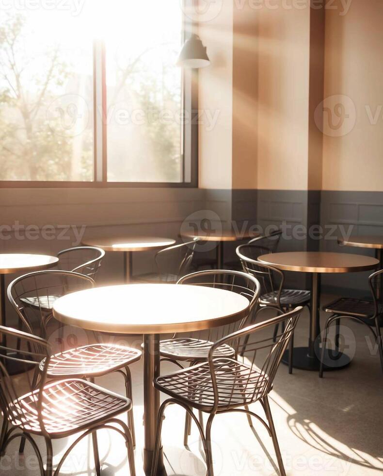 Sunlight streams through a window illuminating empty cafe tables and chairs creating a warm inviting atmosphere for patrons Pro Photo