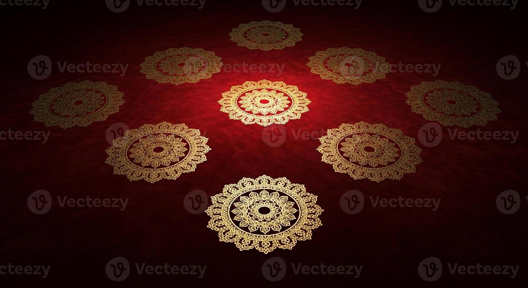 Intricate golden floral medallions arranged in a circular pattern against a deep red background creating a symmetrical and decorative design Pro Photo