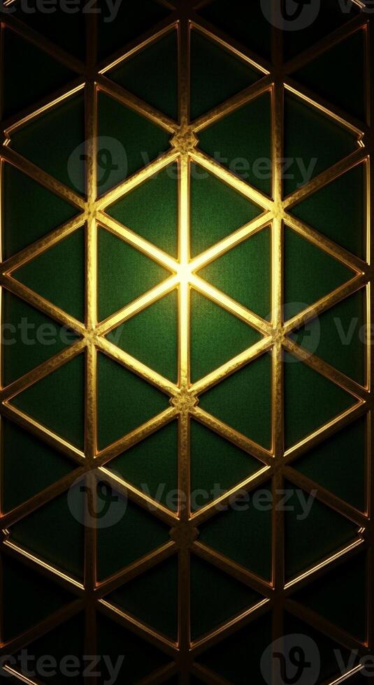 Illuminated geometric lattice structure with a central bright light source and deep green background Pro Photo