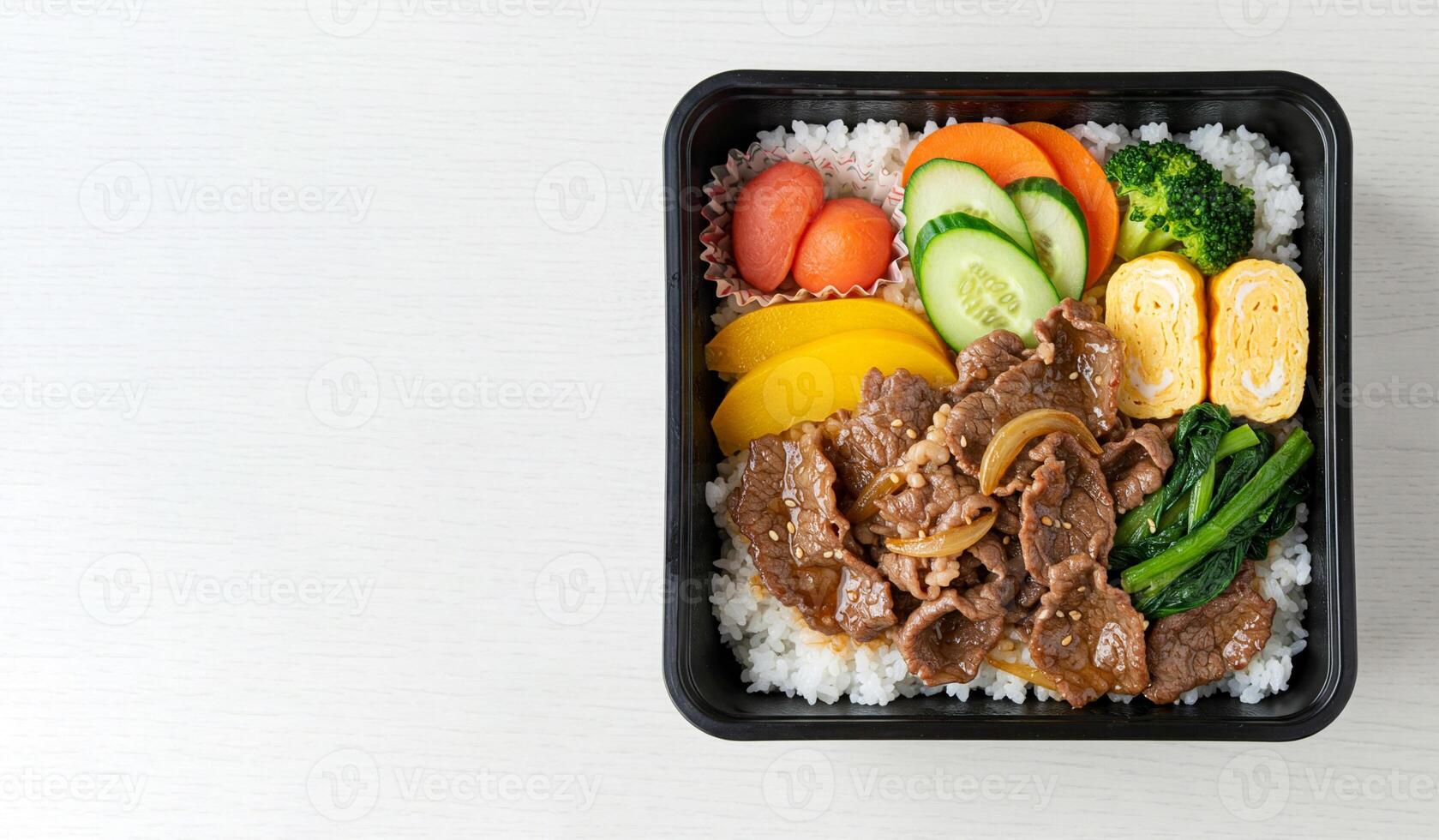 Black bento Box container holds balanced meal of beef stir-fry with vegetables, and white rice in separate compartments. Container is placed on light table background, top view, copy space for text Pro Photo