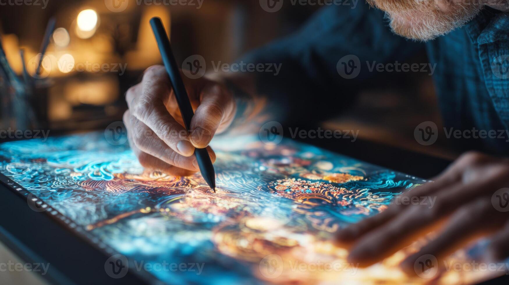 Digital artist creating abstract art on tablet with stylus Pro Photo
