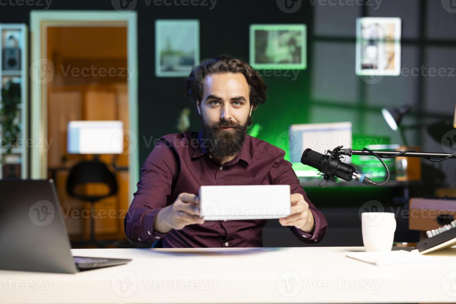 Tech expert filming technology review of newly launched cellphone, doing unboxing and presenting specifications to audience. Vlogger showing mobile phone box to subscribers Pro Photo