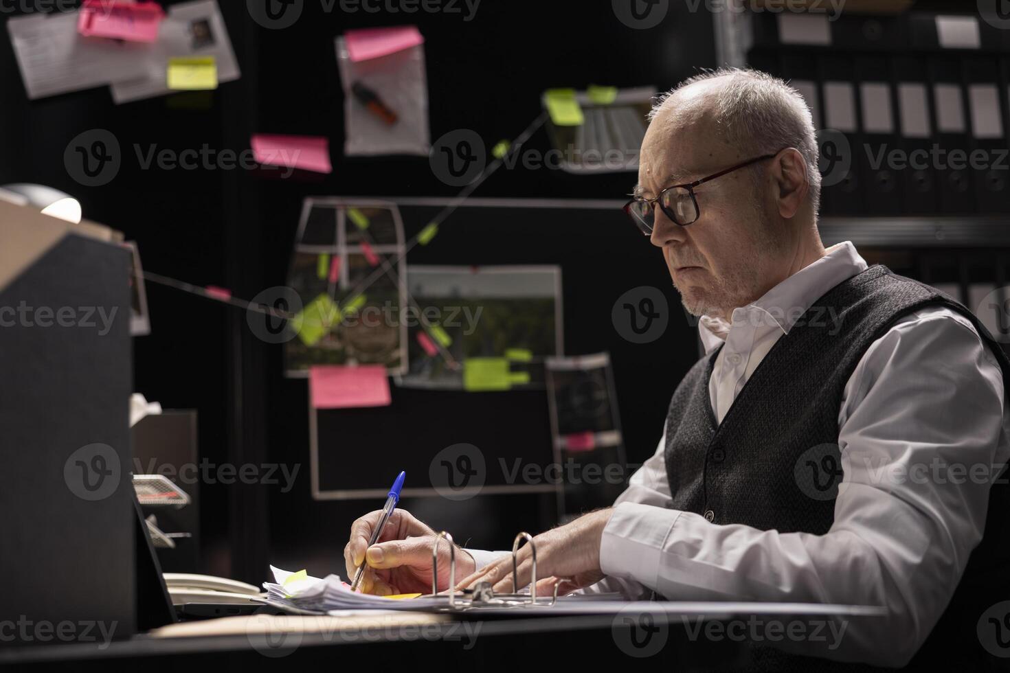 Experienced private investigator working with witness statements from case files, interpreting fingerprints and connecting evidence to prove authenticity in a criminal case. Secret mission. Pro Photo