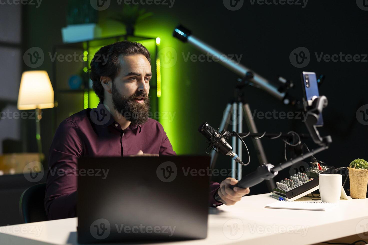 Influencer in home studio recording live broadcast using smartphone on selfie stick, reading messages from fans on laptop. Media star hosting q and a session, filming with phone, answering questions Pro Photo