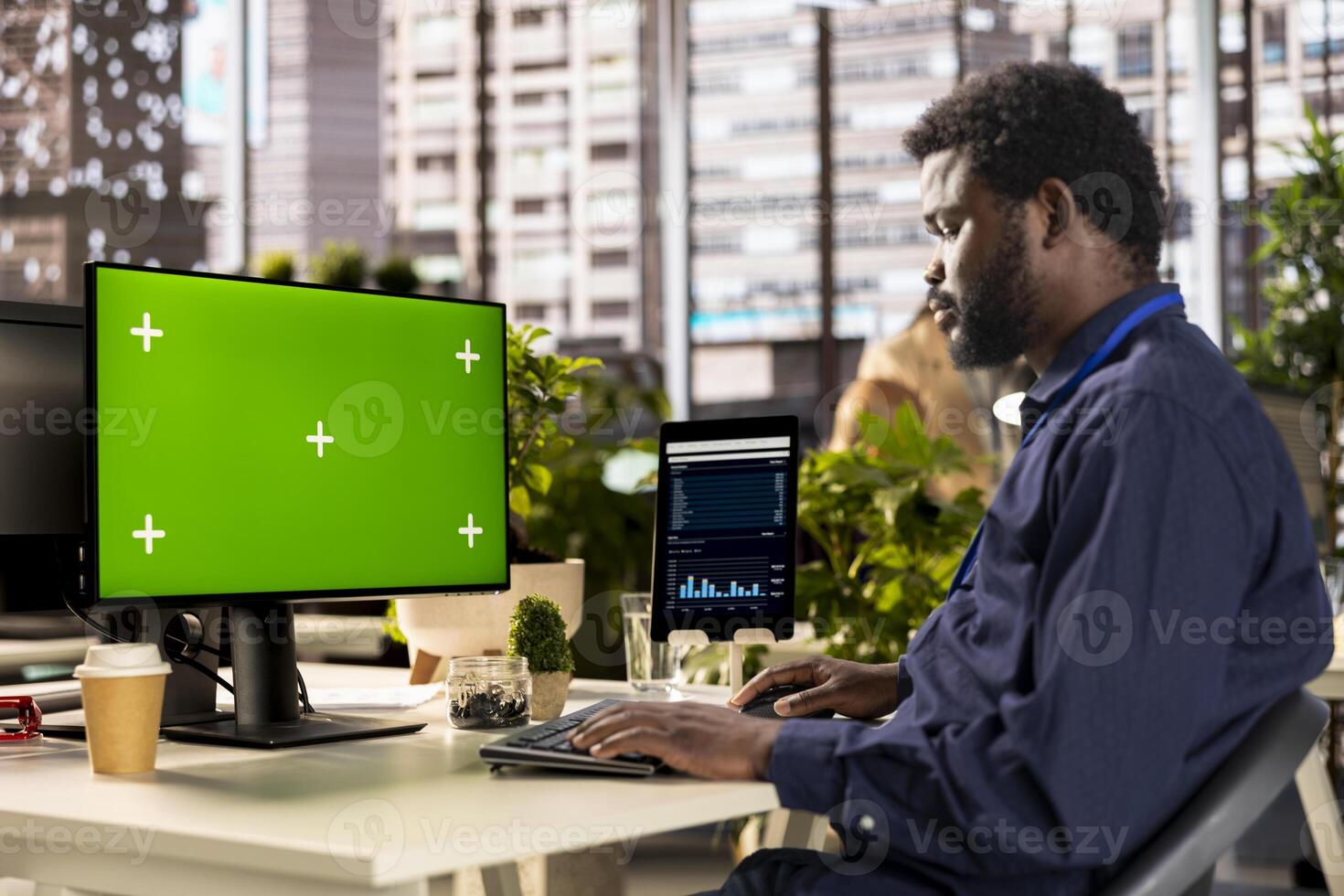 African american analyst finalizing a report with data analytics next to copy space, developing a project for company development. Professional employee engaged in task management at desk. Pro Photo