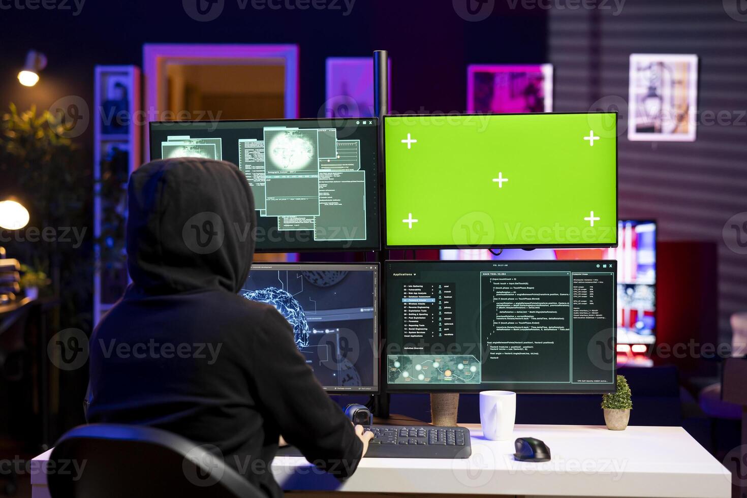 Hacker using green screen PC, coding malware designed to exploit network backdoors. Rogue engineer using mockup computer to bypass security measures such as logins and password protections Pro Photo