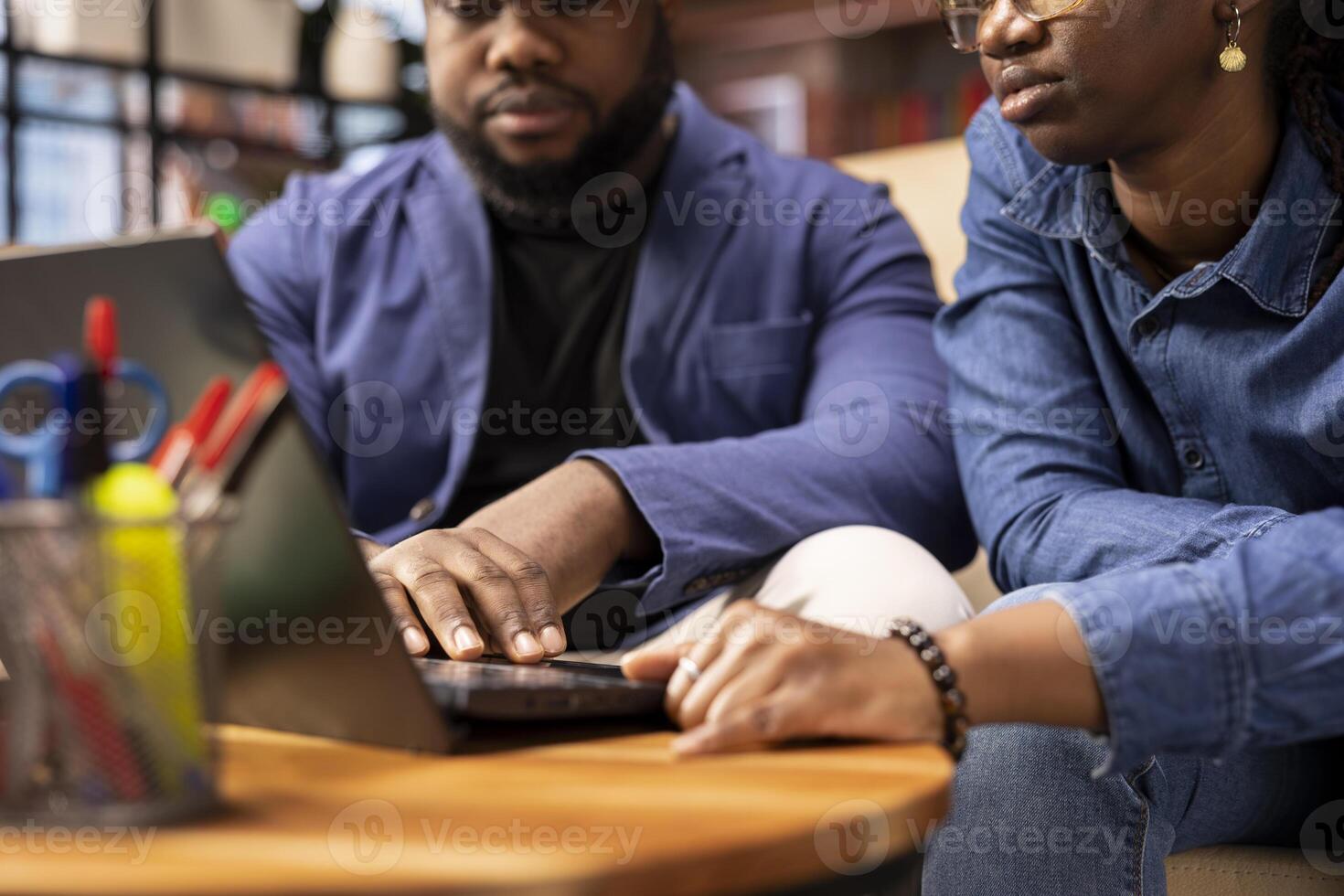 Young remote workers in their living room collaborate on a project, using teamwork and digital online tools to enhance efficiency and productivity. Solving freelancing tasks at the coffee table. Pro Photo