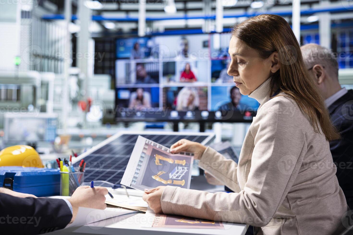 Factory admins look over schematics during call, brainstorming improvements for operational efficiency. Shareholders look over production plant lines blueprints in videoconference Pro Photo