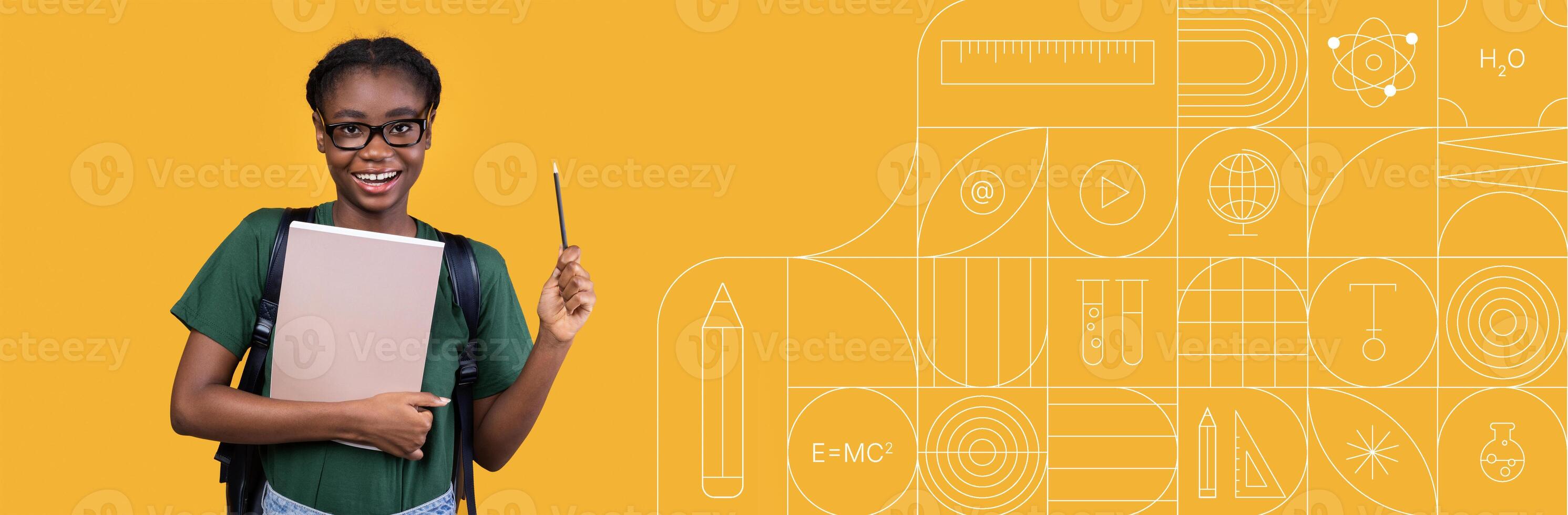 A student stands cheerfully with books and a pencil, smiling while preparing for studies. The background features educational icons, creating a bright and engaging atmosphere for learning. Pro Photo