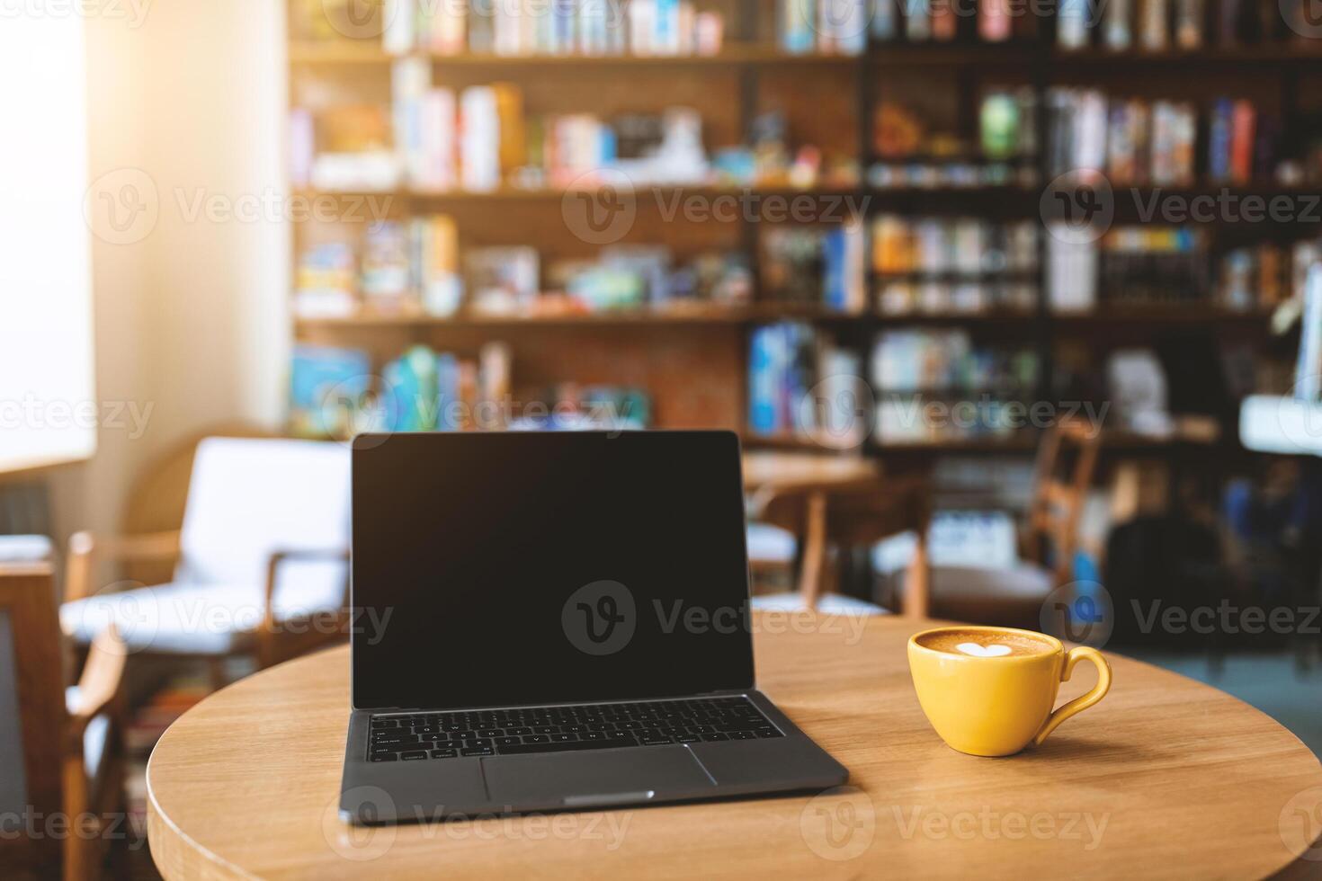 Workplace in cafe. Laptop computer with black blank screen and mug of coffee on wooden table. Notebook screen with copy space for your content. Mockup, empty space Pro Photo