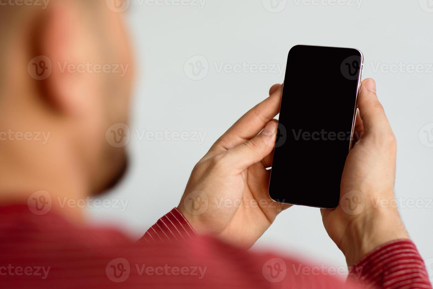 Unrecognizable arab guy using smartphone with blank screen, mockup. Cropped of middle-eastern man holding brand new mobile phone with empty display. Mobile application concept Pro Photo