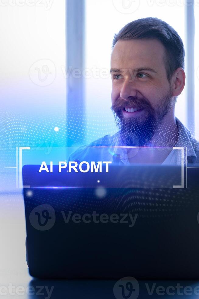 Professional man focused on computer screen while exploring artificial intelligence technologies indoors during daytime Pro Photo
