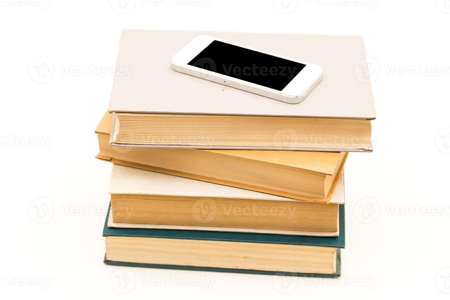 Stacked books with a smartphone resting on top captured in a minimalistic setting Pro Photo