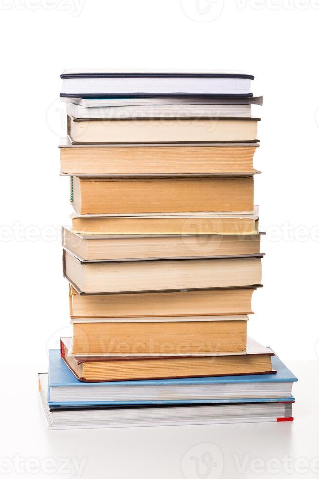 Stack of various books arranged neatly on a table in a well-lit setting Pro Photo