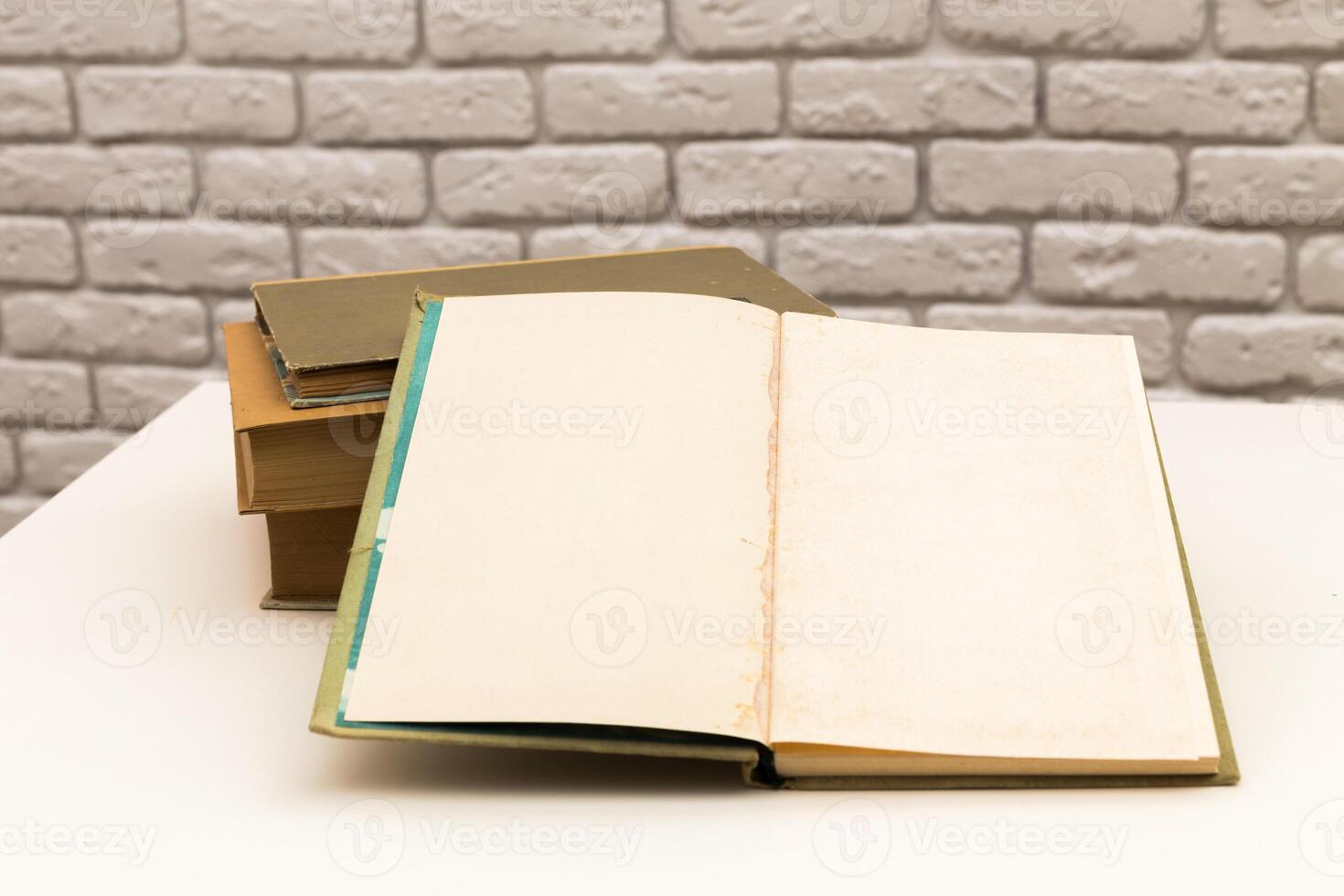 Old books stacked with an open notebook on a table in a cozy room setting Pro Photo