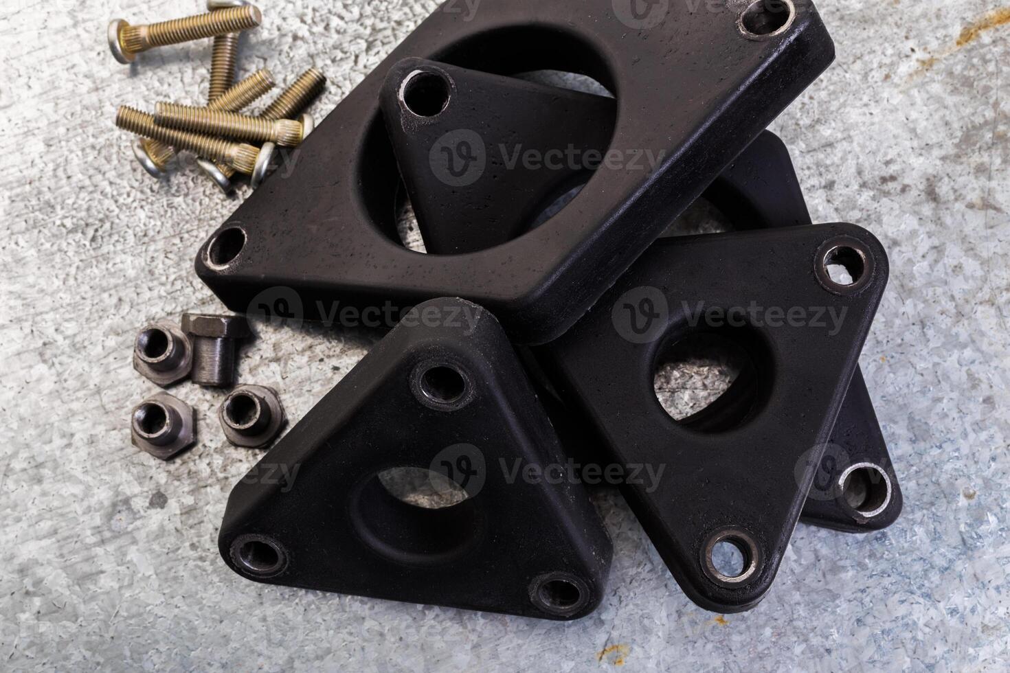 Black triangular rubber components with bolts on a gray surface in a workshop setting Pro Photo