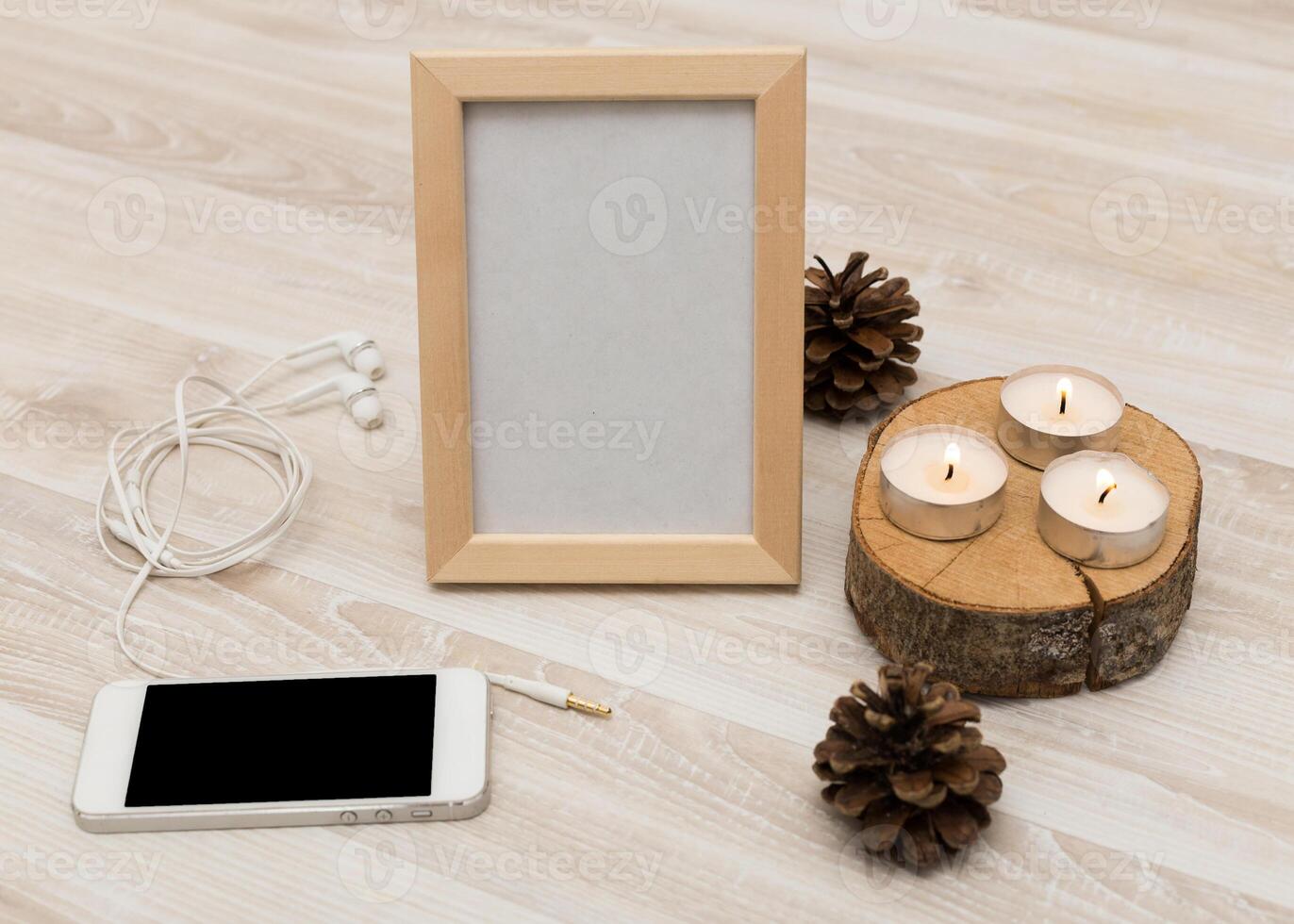 Minimalist workspace setup with phone, candles, and empty picture frame in cozy environment Pro Photo