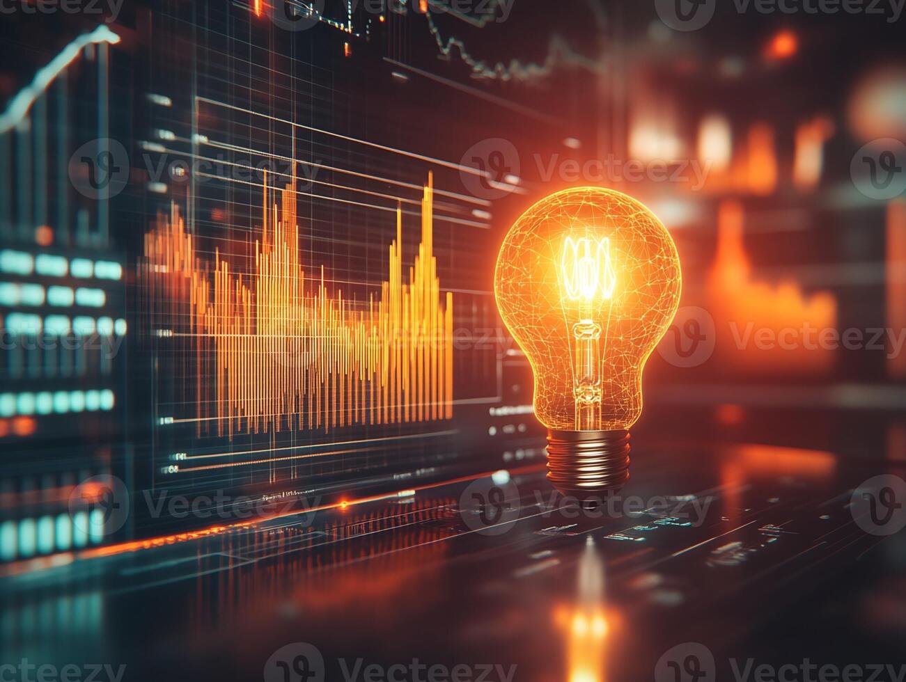 Illuminated Lightbulb and Data Graphs on Computer Screen Pro Photo