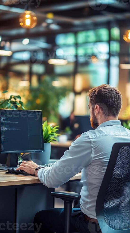 Man Coding at Computer in Modern Office Pro Photo