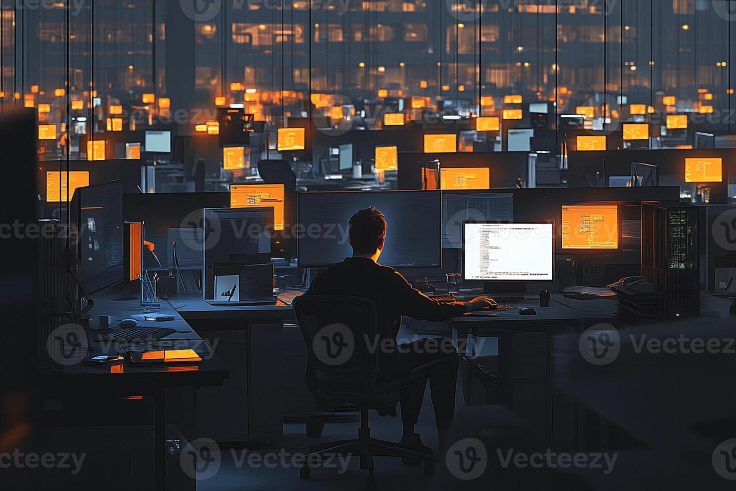 Single Programmer in Large Office with Illuminated Computer Screens Pro Photo