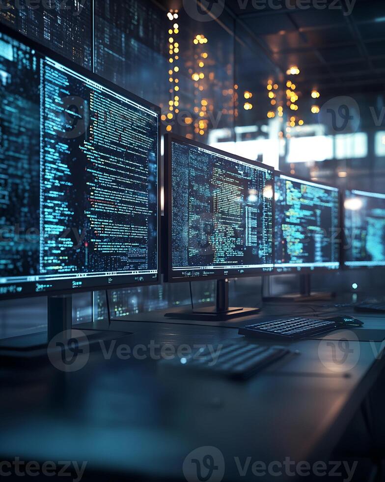 Computer Monitors Displaying Code in a Modern Office Setting Pro Photo