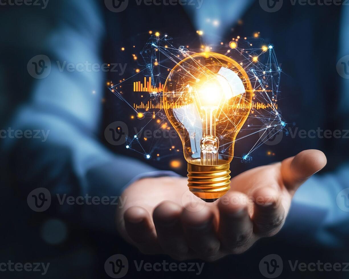 Glowing Lightbulb with Data Network Visualization Held in Hand Pro Photo